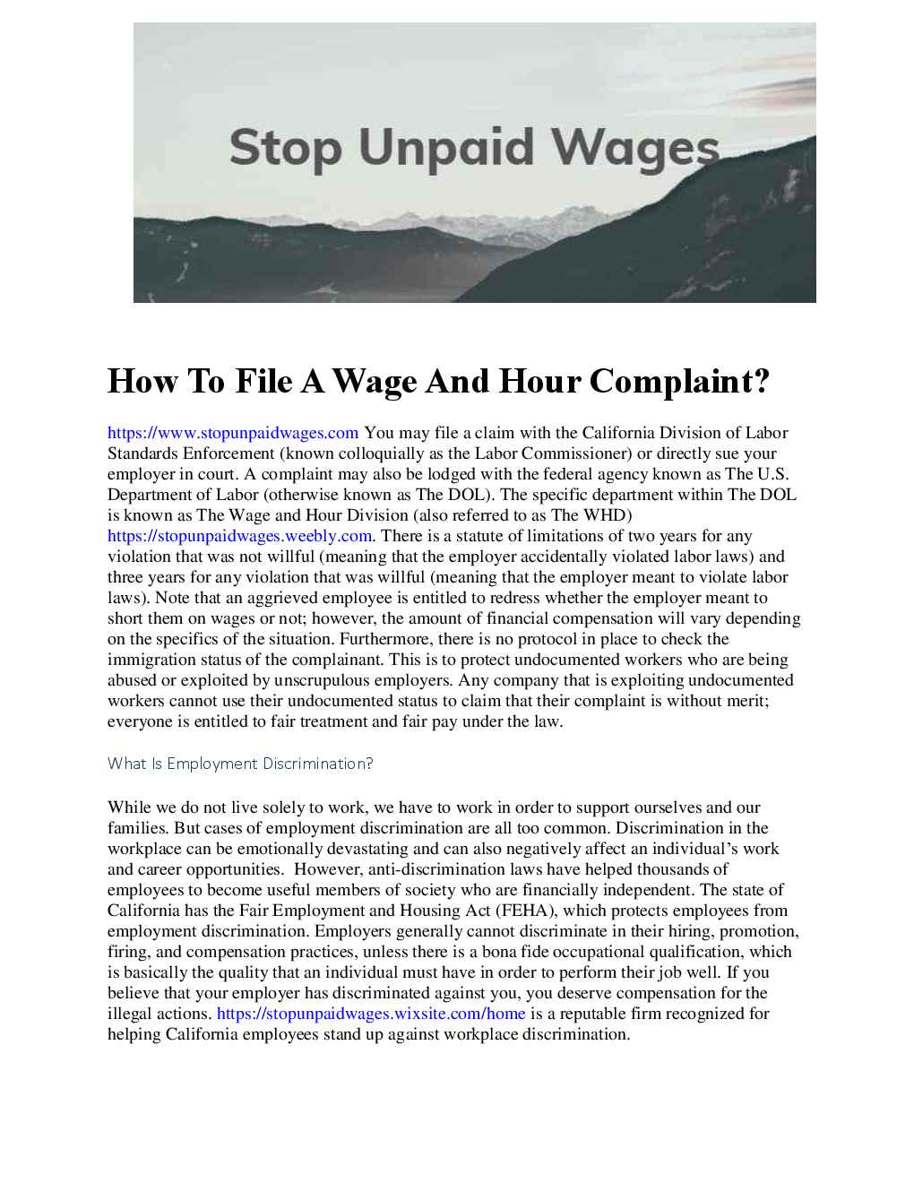How To File A Wage And Hour Complaint? Wage and Hour Attorney You may file a claim with the California Division of Labor Standards Enforcement (known colloquially as the Labor Commissioner) or directly sue your employer in court. A complaint may also be lodged with the federal agency known as The U.S. Department of Labor (otherwise known as The DOL). The specific department within The DOL is known as The Wage and Hour Division (also referred to as The WHD) Unpaid Wage Lawyer. There is a statute of limitations of two years for any violation that was not willful (meaning that the employer accidentally violated labor laws) and three years for any violation that was willful (meaning that the employer meant to violate labor laws). Note that an aggrieved employee is entitled to redress whether the employer meant to short them on wages or not; however, the amount of financial compensation will vary depending on the specifics of the situation. Furthermore, there is no protocol in place to check the immigration status of the complainant. This is to protect undocumented workers who are being abused or exploited by unscrupulous employers. Any company that is exploiting undocumented workers cannot use their undocumented status to claim that their complaint is without merit; everyone is entitled to fair treatment and fair pay under the law. What Is Employment Discrimination? While we do not live solely to work, we have to work in order to support ourselves and our families. But cases of employment discrimination are all too common. Discrimination in the workplace can be emotionally devastating and can also negatively affect an individual’s work and career opportunities.  However, anti-discrimination laws have helped thousands of employees to become useful members of society who are financially independent. The state of California has the Fair Employment and Housing Act (FEHA), which protects employees from employment discrimination. Employers generally cannot discriminate in their hiring, promotion, firing, and compensation practices, unless there is a bona fide occupational qualification, which is basically the quality that an individual must have in order to perform their job well. If you believe that your employer has discriminated against you, you deserve compensation for the illegal actions. Stop Unpaid Wages is a reputable firm recognized for helping California employees stand up against workplace discrimination. We can help you fight for your right to a fair and equal work environment. For prompt and effective legal assistance, call 424-781-8411 or fill out our online contact form to schedule a free, no-obligation consultation. How To Know If You Were Discriminated Against? In California, it’s against the law for an employer to discriminate against a protected class of job applicants and employees. However, most employment discrimination is subtle because employers understand that discrimination is against the law and could result in a lawsuit. As such, they take steps to ensure that they don’t say anything obvious or put anything in writing when dealing with employees and applicants. Even so, there may be signs of discrimination. This may come in the form of treating certain groups of employees different from others. It could also involve a change in attitude towards a worker when an employer discovers that the employee belongs to a certain protected group. Signs of possible discrimination in the workplace involve: * Workload increases or change in work duties * Sudden changes in job performance reviews * Reduced pay or reduced hours * Exclusion from meetings and events * Making fun of a person's sexual orientation or accent * Different rule enforcement when employees of different backgrounds are involved * Failing to consider applicants because they have ethnic-sounding names * Failure of management to condemn and put a stop to sexist or racist jokes made in the workplace Also, it’s possible for employees to be discriminated against by employers who belong to the same protected class as the employee. For instance, a female applicant can be discriminated against by a female boss based on her gender. Alternatively, a Mexican-American employer can discriminate against a Mexican-American applicant or employee.